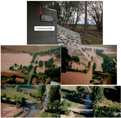 V obci Očelice se povodně vyskytují převážně v letních měsících, při zvýšené srážkové činnosti. V minulosti největší dopad na fungování obce měli povodně v roce 1998, kdy došlo k extrémnímu rozlivu toku mimo běžné koryto a zaplavení objektů a komunikací. Vlivem proudícího spláví v toku Dědiny a následného zachytávání na středovém pilíři došlo při kulminaci ke zhroucení tělesa mostu. Výšku povodňové vlny ilustruje povodňová značka na nově vybudovaném mostě. V pozadí na fotografii je patrný kriticky ohrožený objekt Městec nad Dědinou č. p. 2, který od katastrofické povodně v roce 1998 byl vyplaven ještě několikrát.