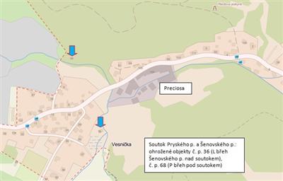 V blízkosti Pryského potoka můžeme za kritické označit všechny objekty a komunikace v bezprostřední blízkosti toku. Záplavové území sice není stanoveno, avšak zkušenosti z povodní v minulosti poukázaly na riziko lokálních rozlivů. Vzhledem k povaze toku je nutné dbát zvýšené pozornosti u mostů a lávek (několik lávek v obci je umístěno jen velmi nízko nad běžnou hladinou), kde je důležité dbát na průtočnost. Naplaveniny zadržované pod mostními tělesy nebo v blízkosti mostů mohou celkově zhoršit průběh povodně. Může dojít ke vzniku lagun a zaplavení míst, odkud nebude plynulý odtok, může dojít k rozšíření rozlivu nebo poškození břehů a mostních těles.